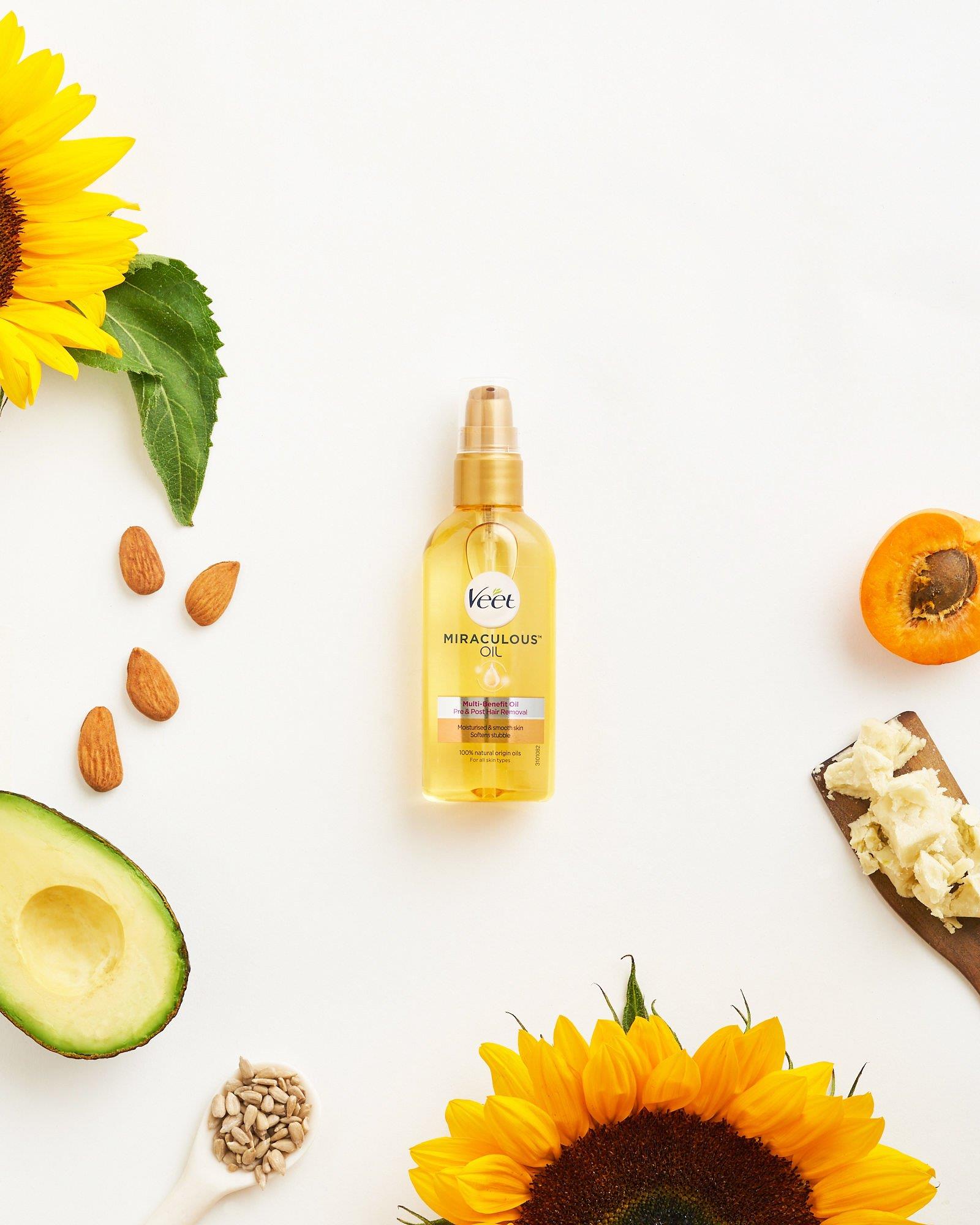 A multi-use oil that has been dermatologically tested for all skin types. You can use Veet Miraculous™ Oil on your face and body.